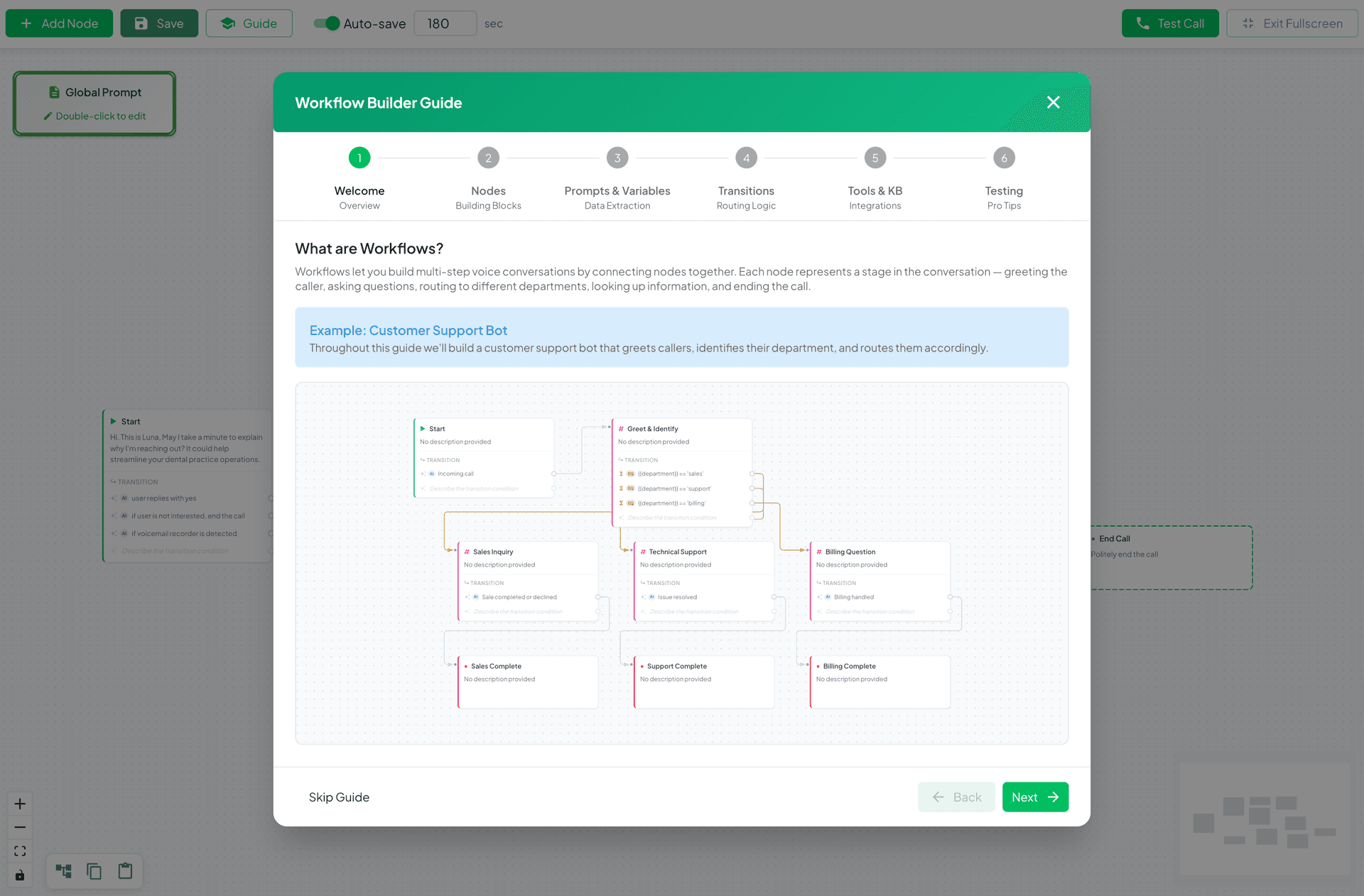 Prompts stay focused. Each node prompt does one thing well instead of juggling multiple responsibilities. Your "Greet Caller" prompt doesn't need to know about payment processing.