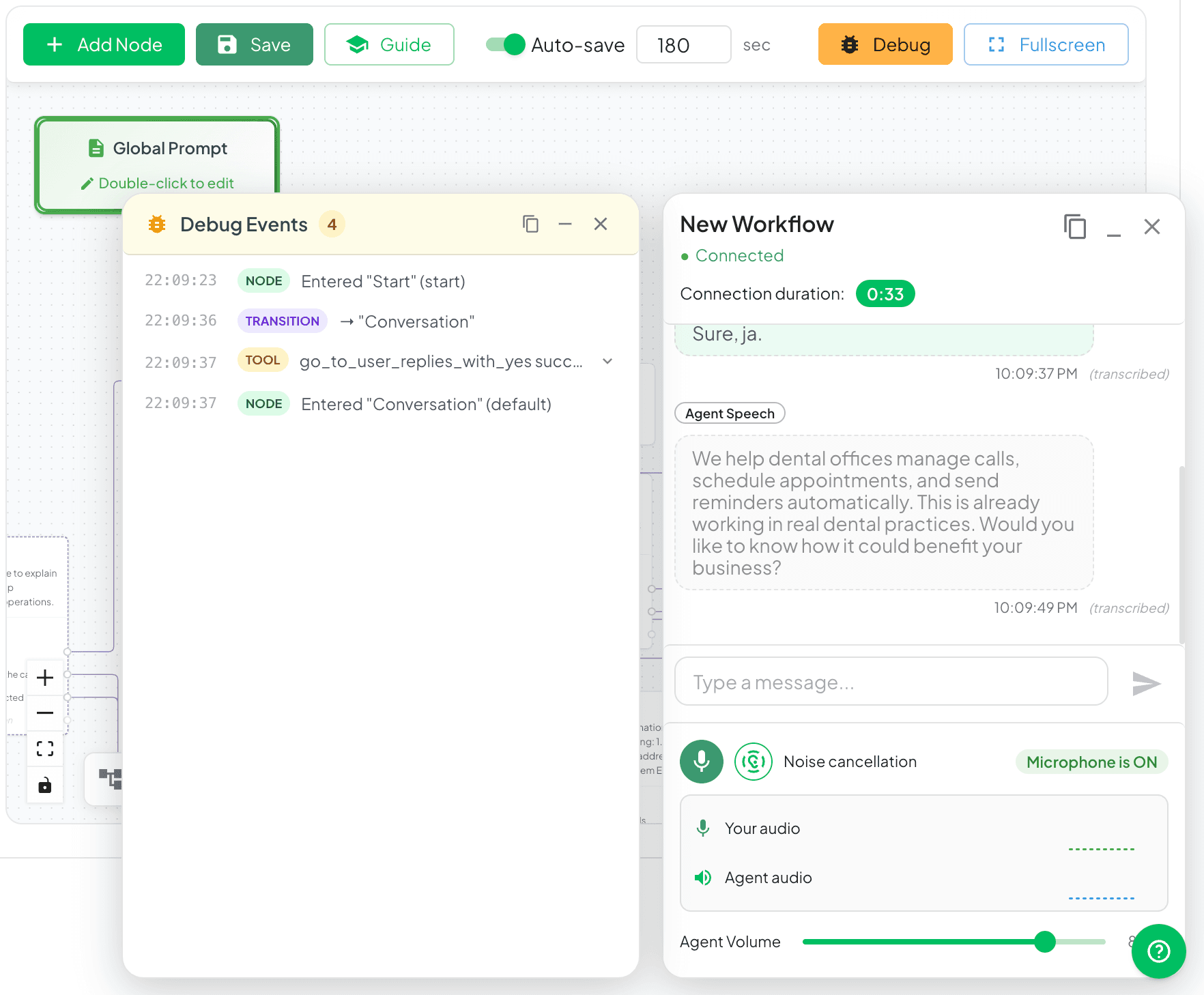 Testing is isolated. You can test individual nodes without running full conversations. Test your knowledge base search node with sample queries. Test your routing conditions with edge cases.