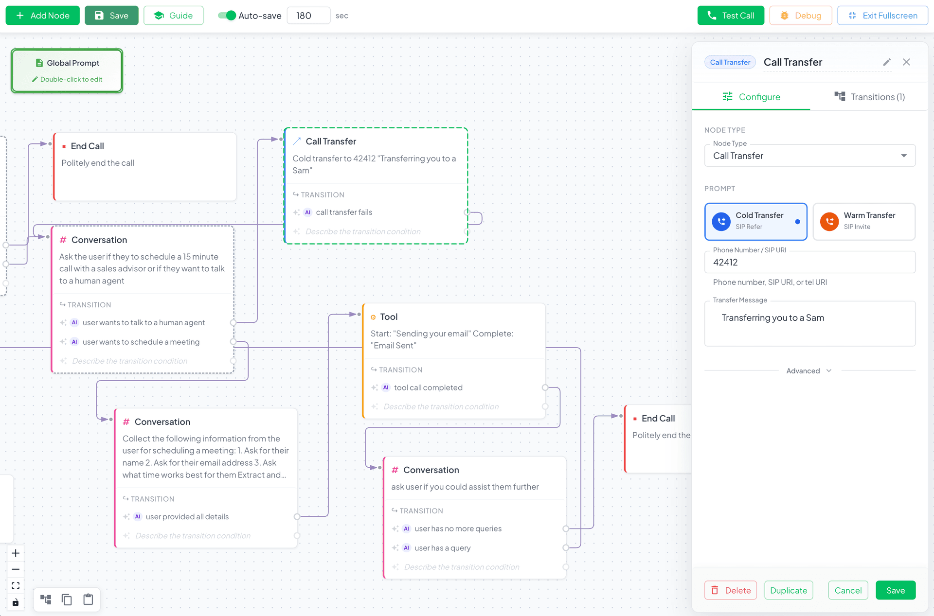 A Call Transfer node is being configured. The side panel shows transfer type (cold/warm), destination number, and custom messages. Transfer conditions can be based on variables like{{sentiment}} == 'negative'or{{call_duration}} > 300.