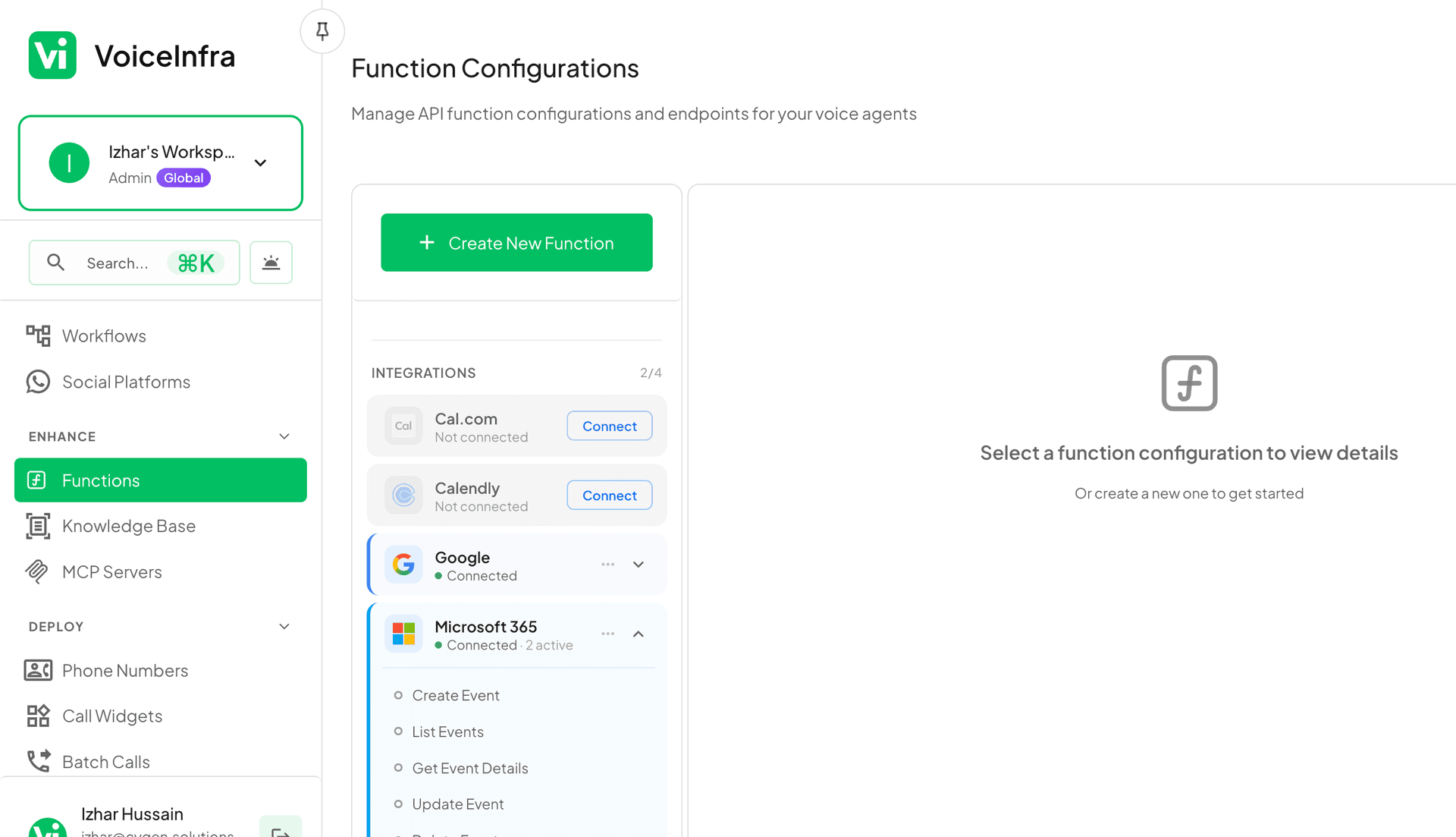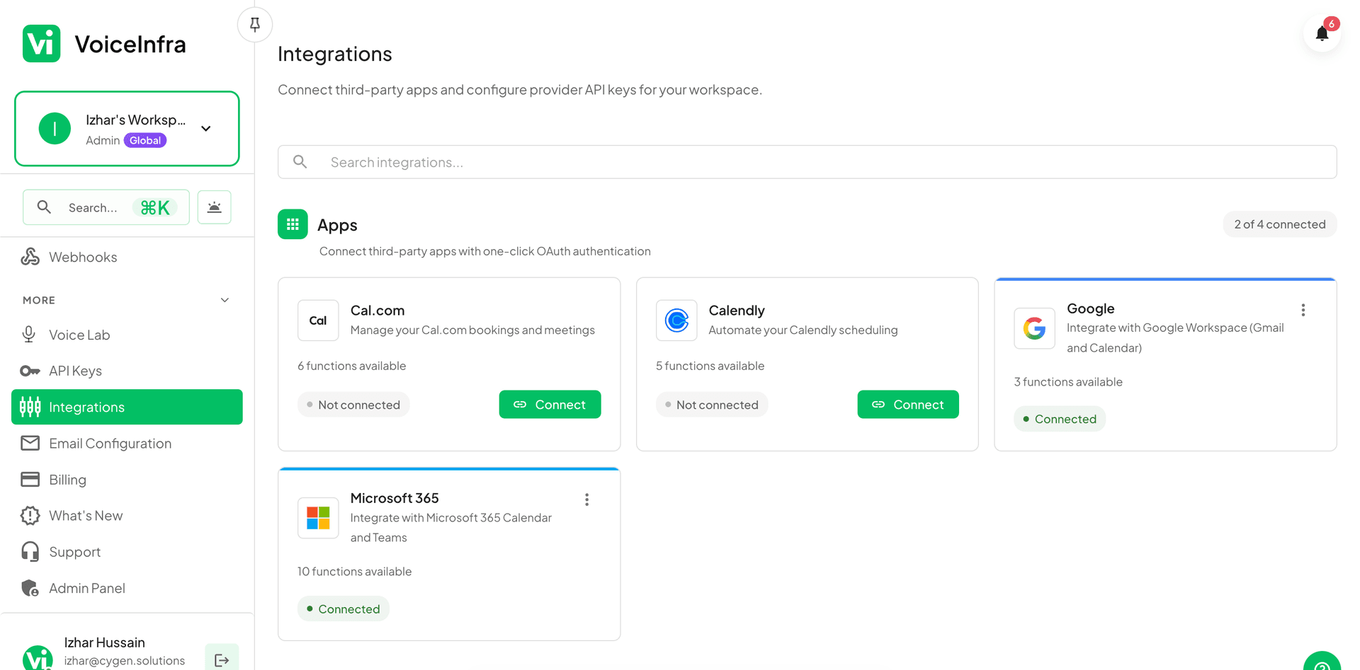 VoiceInfra's AI voice agents connect directly to Microsoft 365 through secure OAuth 2.0 authentication, enabling natural language control over calendar events and Teams messaging.