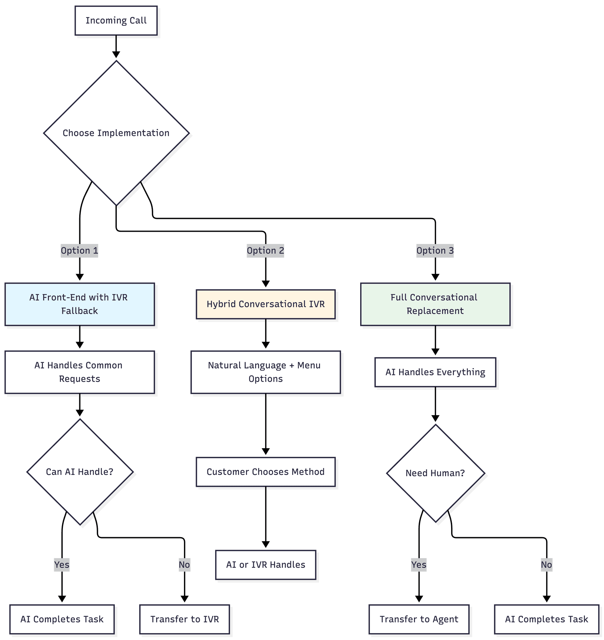 Let's walk through a practical implementation using Option 1 (AI Front-End with IVR Fallback) since it's the lowest-risk approach.